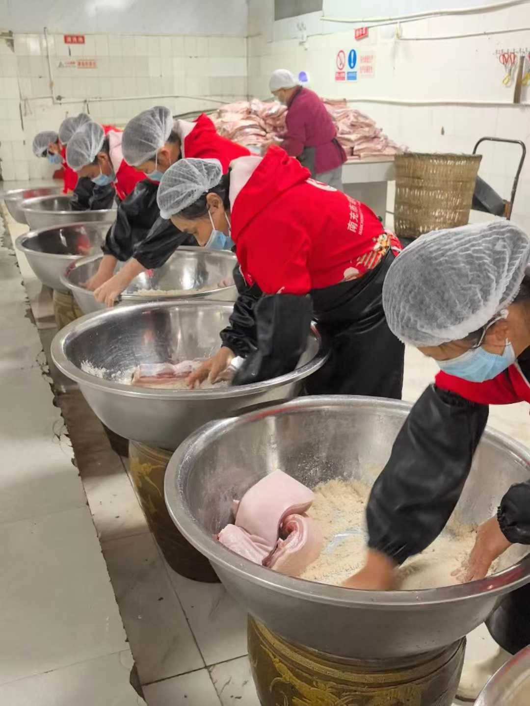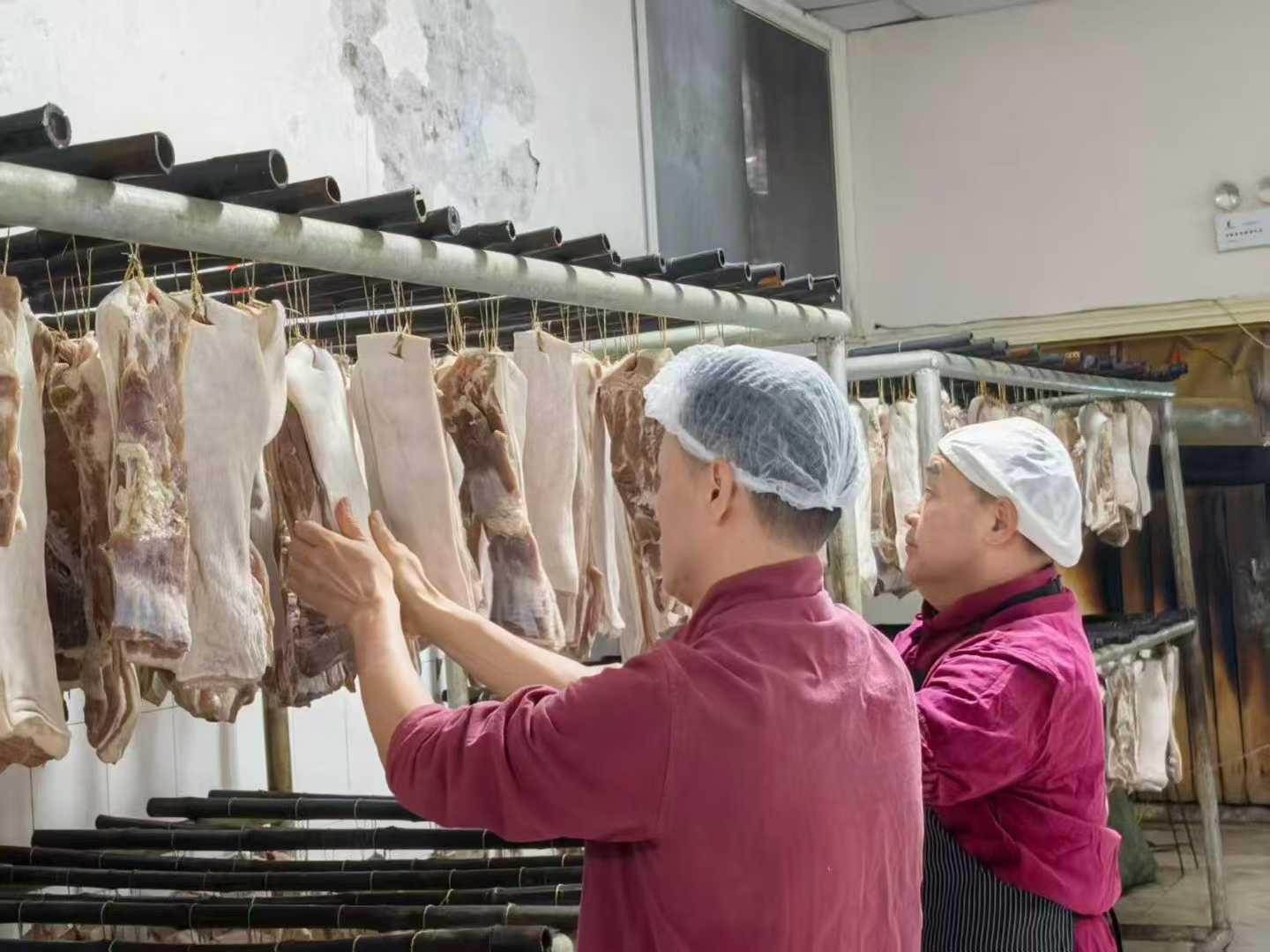 做藏香黑豬臘肉,我們還是守著老規(guī)矩來(lái)!精選豬五花、后腿肉這些好部位,用自貢井鹽搭配本地花椒、桂皮手工揉腌,腌夠7天再翻一次身,確保每一寸肉都吸滿香料味。之后掛起來(lái)曬足山風(fēng)日曬,最后進(jìn)烘房用松柏、橘皮文火慢熏20多個(gè)小時(shí),沒(méi)有任何添加劑,全靠時(shí)間和手藝沉淀出醇厚臘香。
